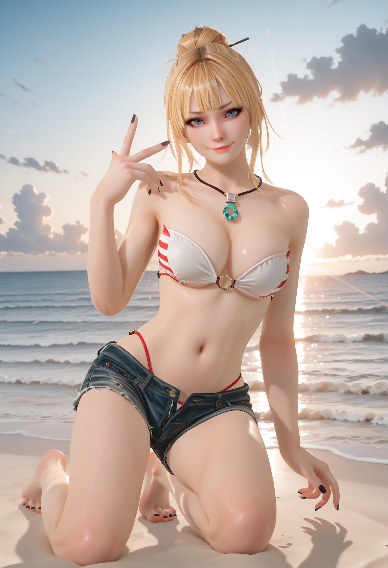 brown strap bikini, silver buckle, fringe trim armlet, brown embroidered leather gloves,