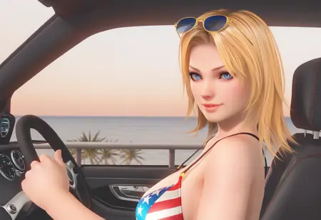 american flag bikini, fringe trim armlet, brown embroidered leather gloves,