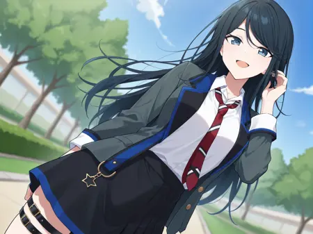 long hair,black hair,swept bangs,necktie,collared shirt,black hair,breasts,jacket,red necktie,striped,skirt,looking at viewer,long hair,thigh strap