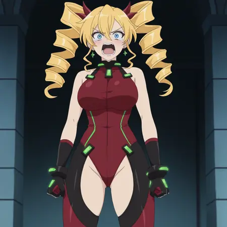 ClaireHarveyHundred, blonde hair, twin drills, hair between eyes, blue eyes, large breasts, red leotard, crotch cutout pants, bare shoulders, green jewelry, gloves,