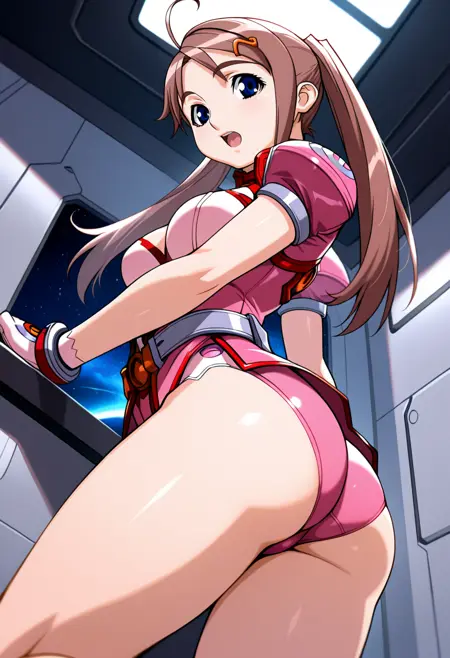 pink pilot suit, choker, puffy short sleeves, cleavage cutout, leotard, grey belt, bare legs, white gloves, brown hair, hairclip, ahoge, twintails, long hair, blue eyes