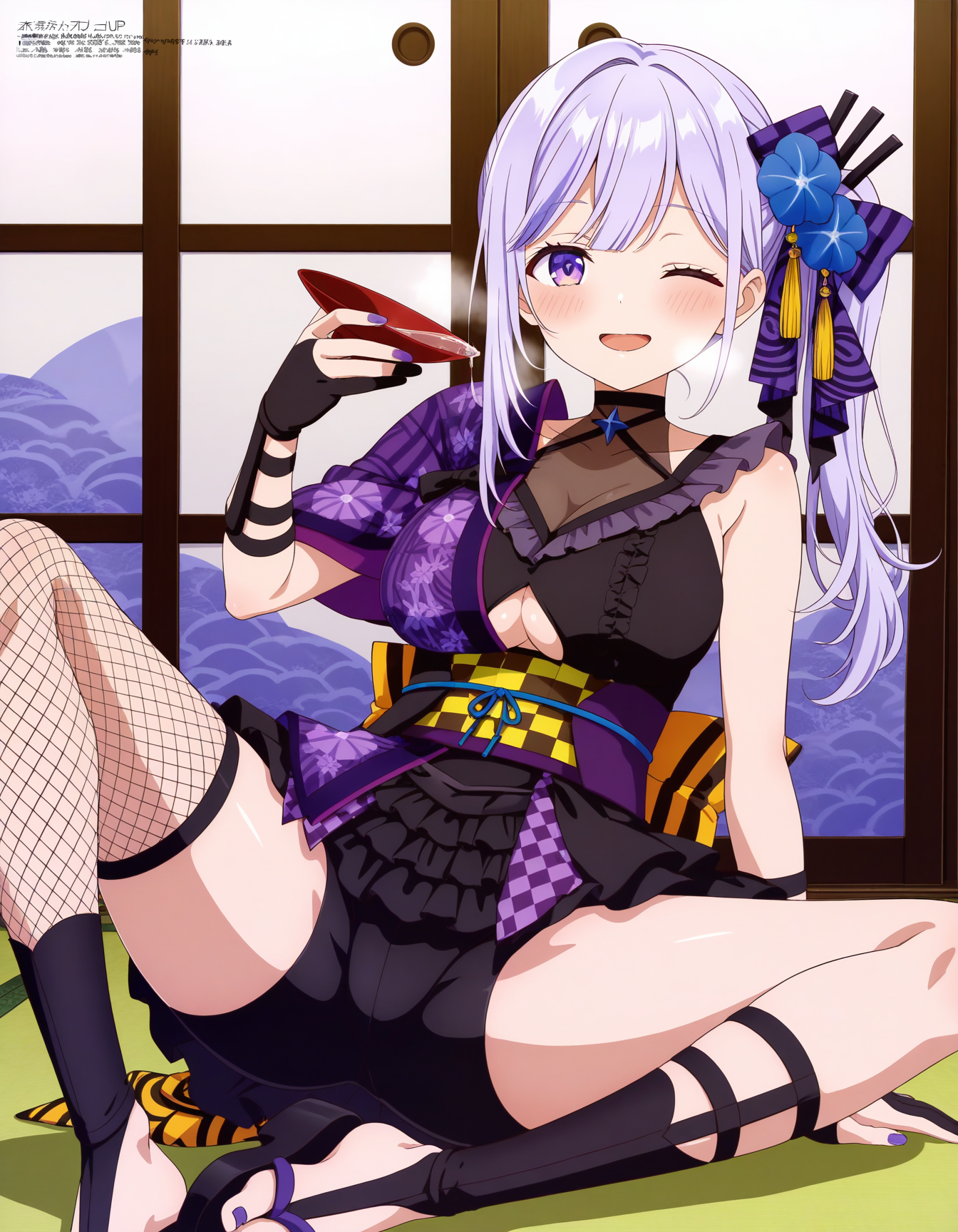 | トレーニングワード | <lora:asano_ruri:1>,asano_ruri, virtual youtuber,purple eyes, purple hair, hair ornament, side ponytail, hair flower, bangs, hair bow, long hair, nail polish,コピーしました! japanese clothes, fishnets, thighhighs, obi, sash, kimono, gloves, flower, single thighhigh, asymmetrical legwear, bow, black gloves, fishnet thighhighs, fingerless gloves, sandals, gradient, uneven legwear, skirt, dress, short kimono, purple kimono, choker, short sleeves, black skirt, black dress, underboob cutout, shorts, bike shorts, partially fingerless gloves, ninja, ribbon, black shorts, bare shoulders,コピーしました! |