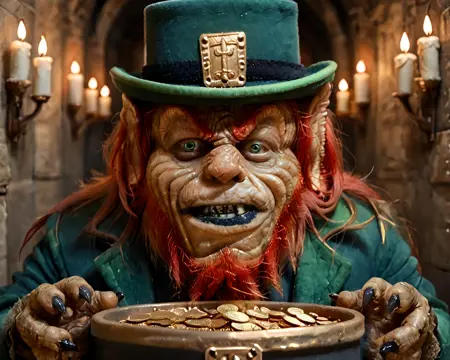 wrinkled skin, gnome, green jacket, striped knee socks, black shoes, gold buckles, green hat, black teeth, black lips, long hair, red hair, beard, red beard green eyes, no human, midget