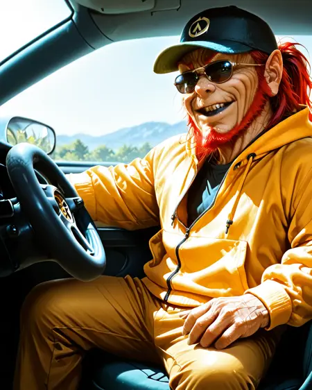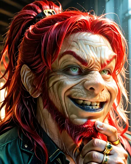 wrinkled skin, gnome, green jacket, striped knee socks, black shoes, green hat, black teeth, black lips, long hair, red hair, beard, green eyes, no human,