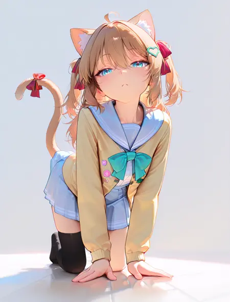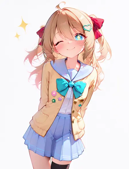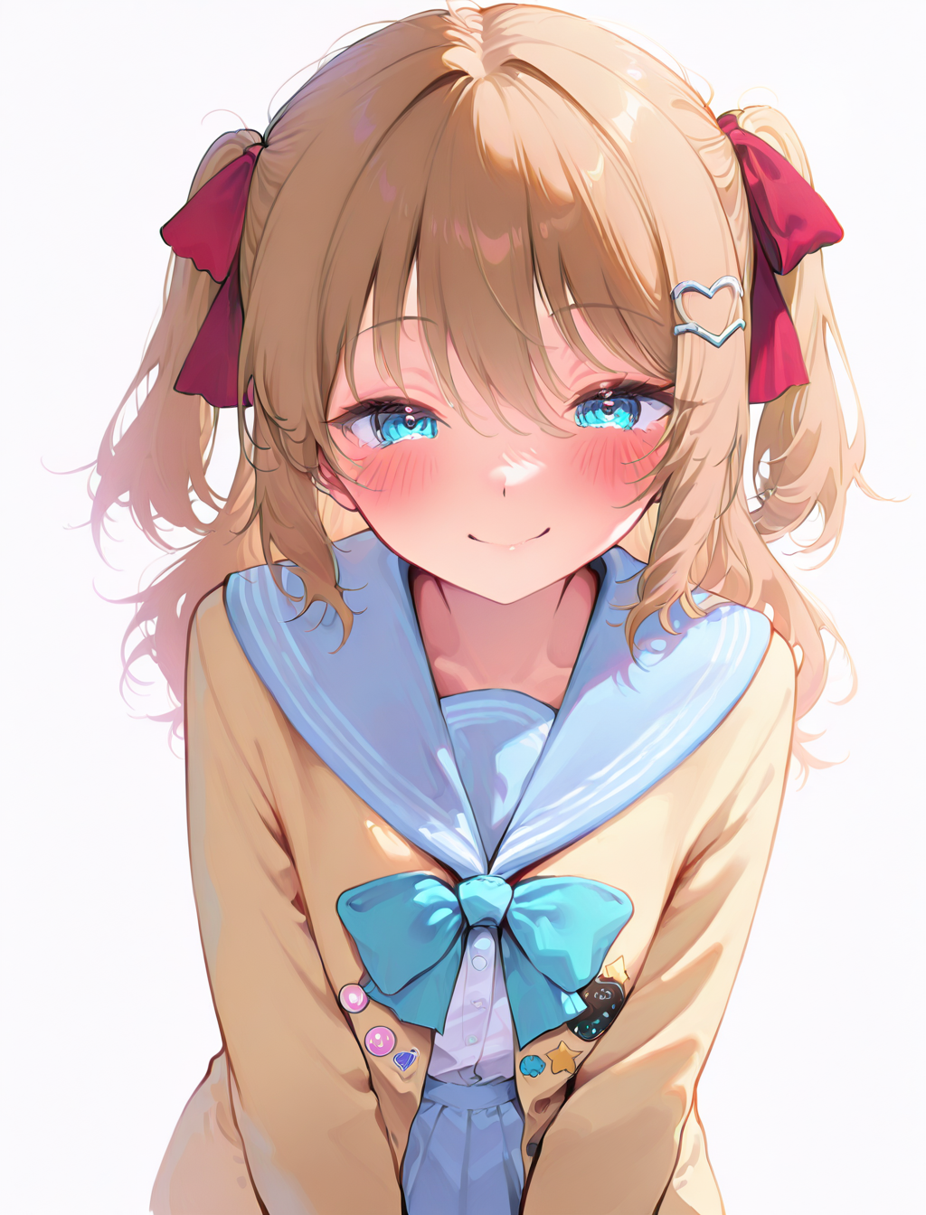 yellow jacket, pin, white shirt, sailor collar, blue skirt