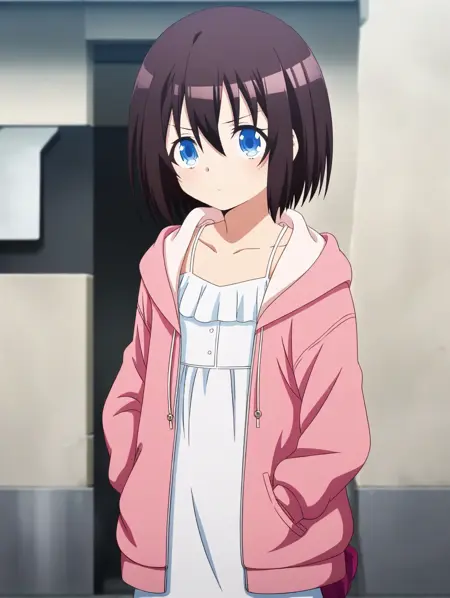 lora:OgataKanna-ILXL-v1:1,ogatakanna,brown_hair,blue_eyes,pink_jacket,white_dress,