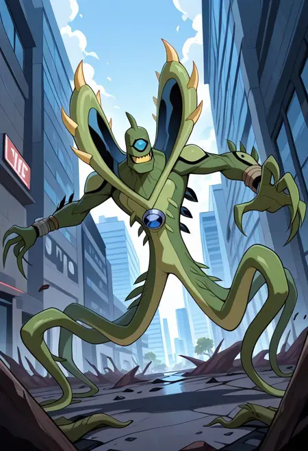 wildvine, solo, green skin, alien, monster, one eye, blue eye, green skin, , spikes, claws, green background, green tentacles, yellow teeth, big smile,