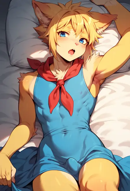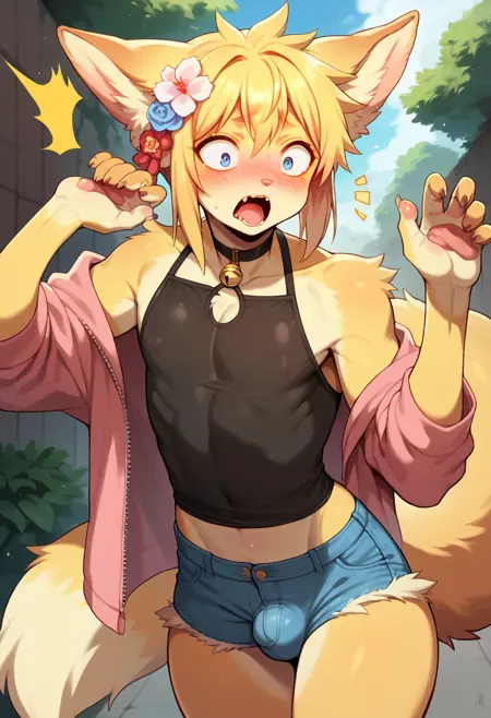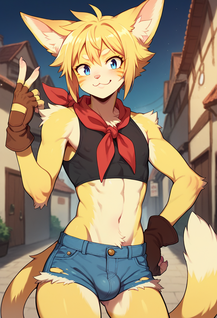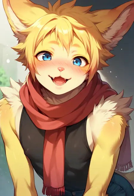 手套、毛茸茸的、棕色手套、蓝眼睛、动物耳朵、露指手套、金发、吻部、猫耳、狐狸耳、毛茸茸的男性、围巾、短发、刘海、黄色毛发、身体毛发、头巾、围巾、动物鼻子、双色毛发、红色围巾、肩部毛发、1个男孩、男孩子的、男性、女性化男性、 femboy