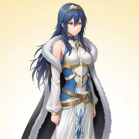 LucinaExalt, long hair, blue hair, hair between eyes, tiara, blue eyes, dress, cape, fur trim. white dress, detached sleeves,