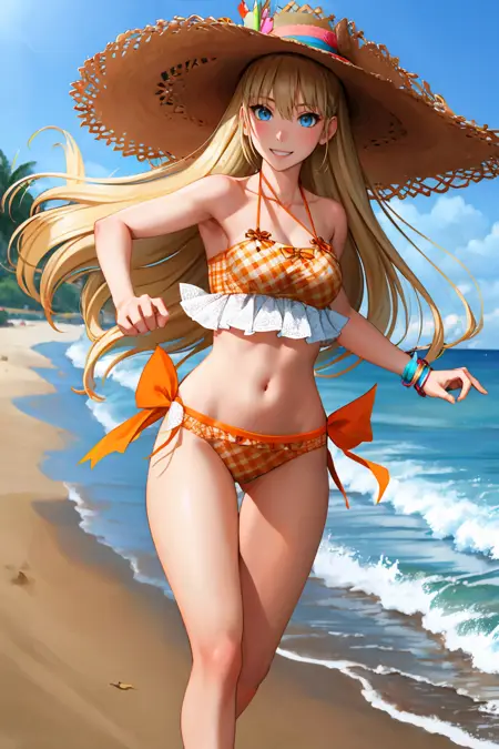 수영복을 위해 "짚 모자, 프릴이 있는 비키니, 오렌지색 비키니"를 추가하세요. 이 복장은 데이터가 제한적이어서 불안정합니다.