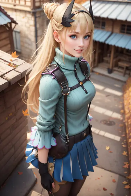 일반적인 룩을 위해 "헤어밴드, 헤어 장식, 재킷, 리브드 스웨터, 터틀넥, 손가락 없는 장갑, 치마, 팬티스타킹"을 추가하세요. 재킷은 제거할 수 있습니다.