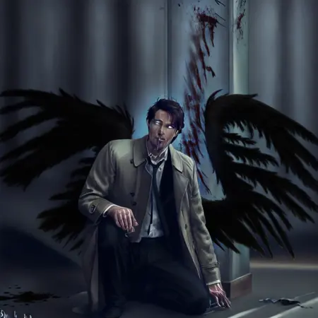 fallen angel wings,large broken wings,damged broken wings,crooked and withered wings,glowing red eyes