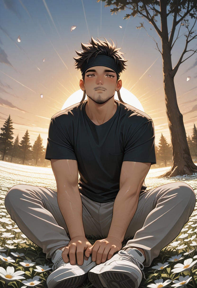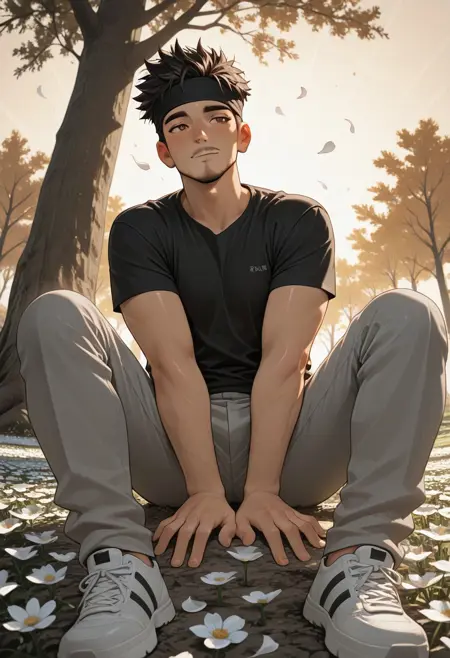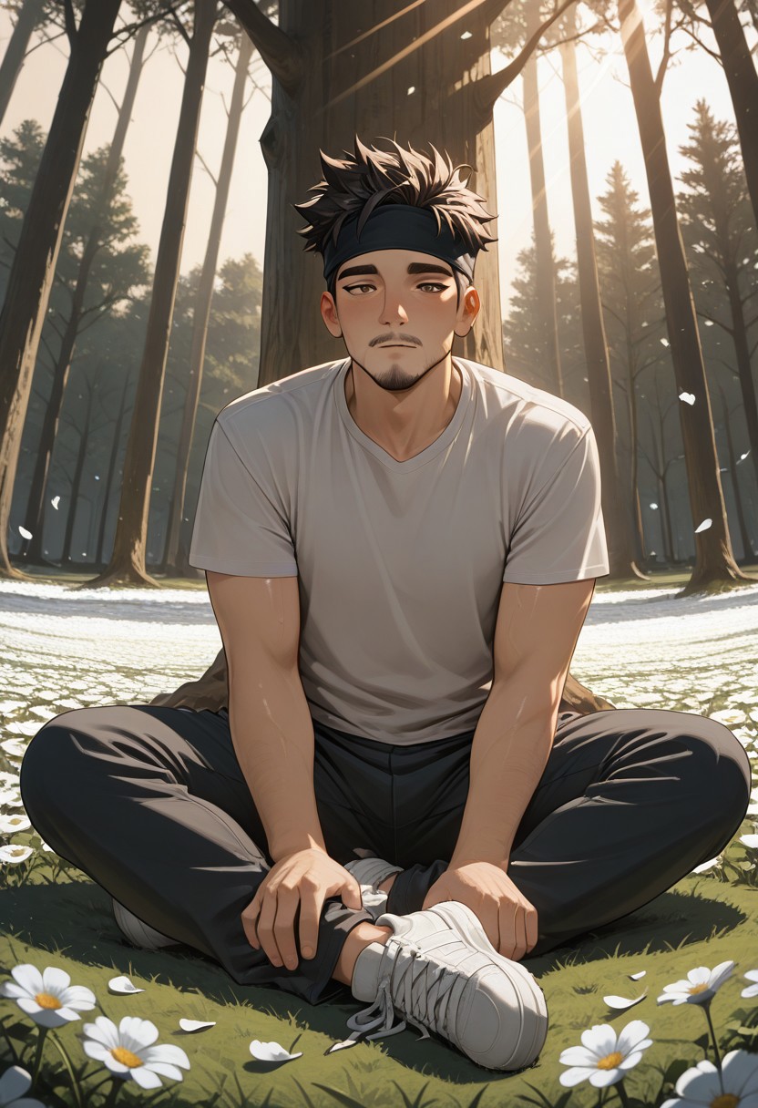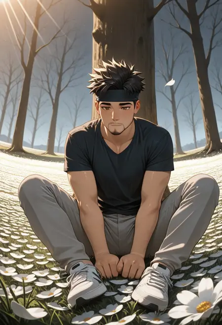 1boy, black hair, spiked hair, brown eyes, headband, facial hair
