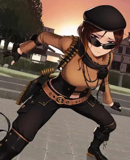 服装: 太阳镜,帽子,围巾,贝雷帽,螺纹毛衣,长袖,弹药带,项链,黑玫瑰,腰带,黑色手套,斜挎弹药带,裤子,靴子