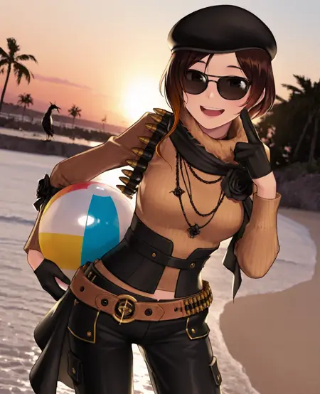 복장: 선글라스, 모자, 스카프, 베레모, 리브 스웨터, 긴 소매, 탄약 벨트, 목걸이, 검은 장미, 벨트, 검은 장갑, 밴돌리어, 바지, 부츠