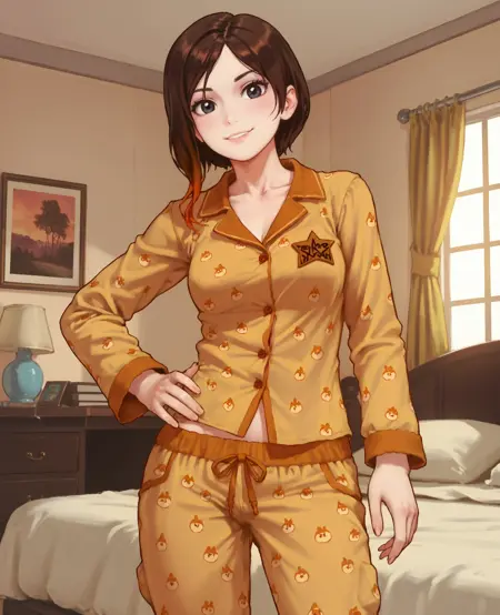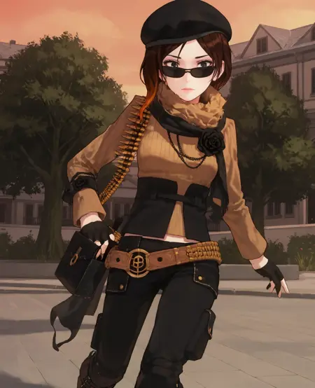 복장: 선글라스, 모자, 스카프, 베레모, 리브 스웨터, 긴 소매, 탄약 벨트, 목걸이, 검은 장미, 벨트, 검은 장갑, 밴돌리어, 바지, 부츠