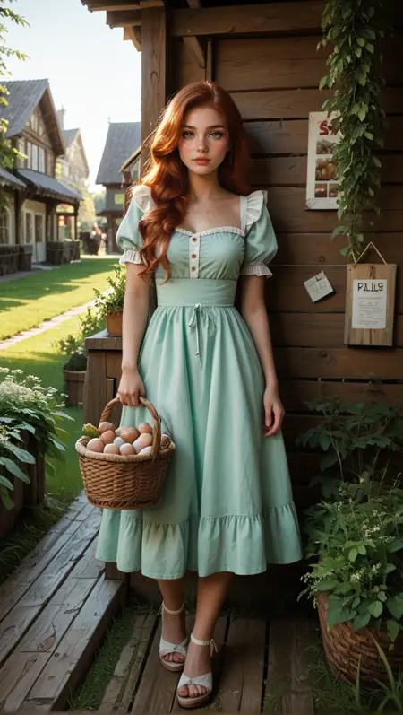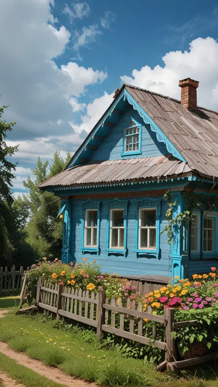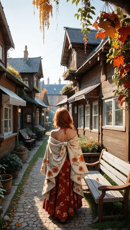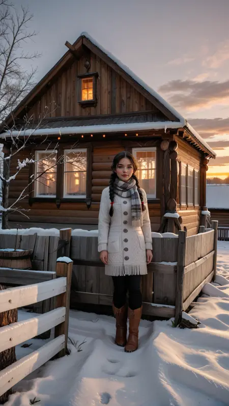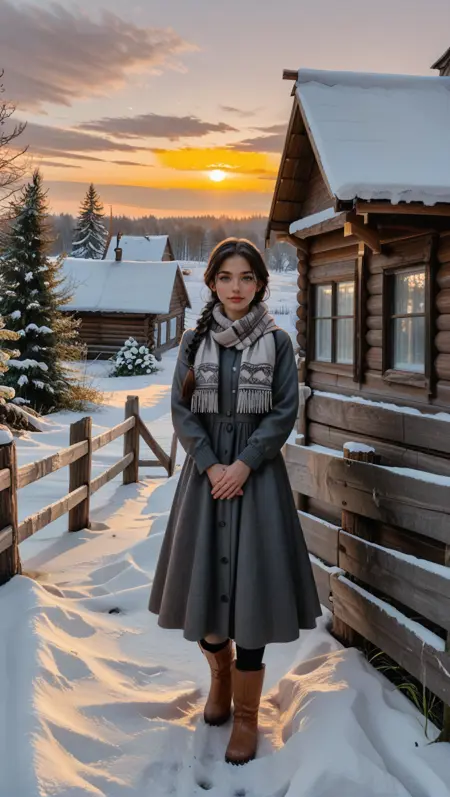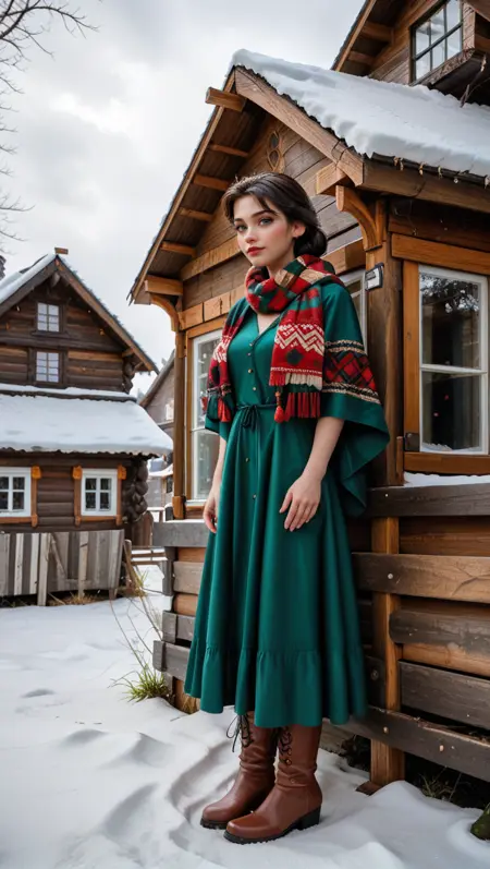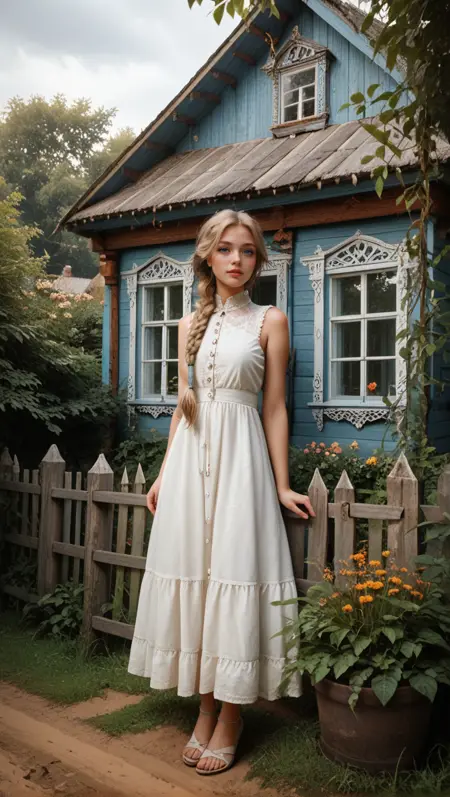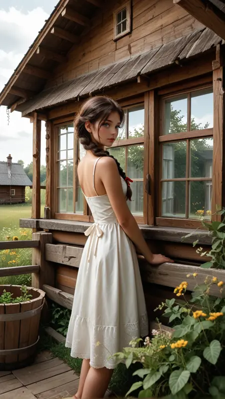ロシアの村の雰囲気は、ロシアの村で静かな夏の朝を描いた雰囲気で、木造家屋の香りと庭の香りが混ざり合っています。編み込みヘアスタイルに刺繍入りのドレス、頭に花を挿した女の子たまるまるおとぎ話から出てきたかのようです。背景には、彫刻された窓枠、柵、豊かな花々、古びた木に舞う日光が広がっています。このスタイルは、優しさ、静けさ、そして少しの神秘的な雰囲気に満ちており、まるで各フレームに忘れられた世界の一部が隠されているかのようです。民族的な美しさ、田舎の美学、そして一点の魔法を組み合わせたシーンに最適です。