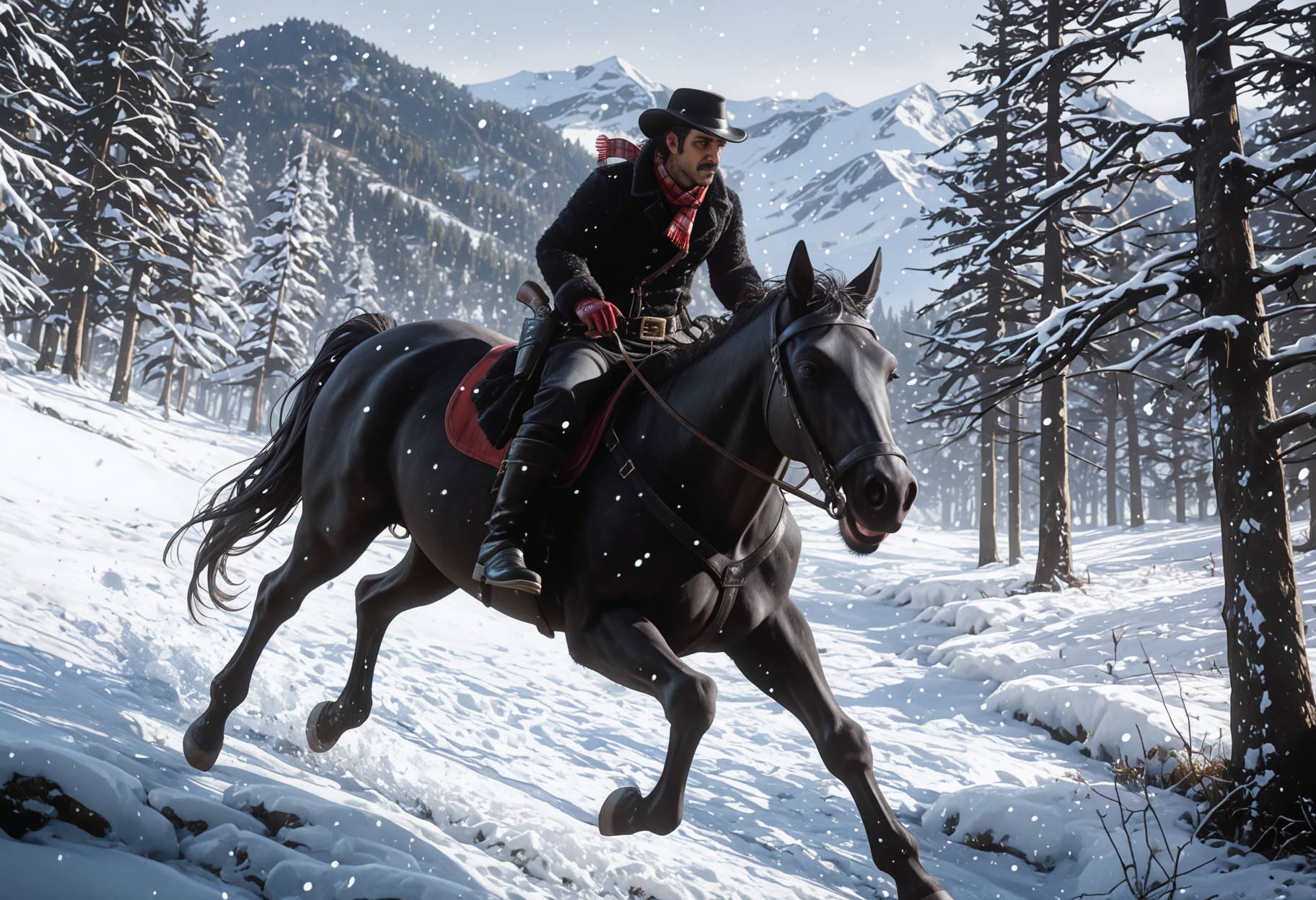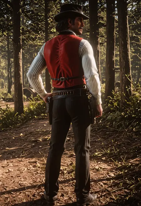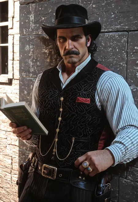 rdr2dutch, mature male, black slicked back wavy hair, brown eyes, thick mustache, stubble