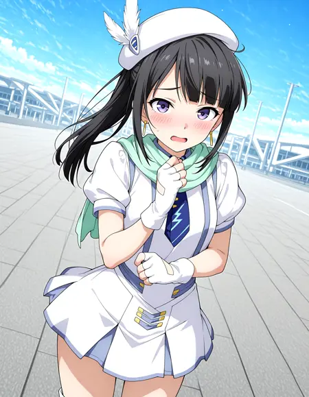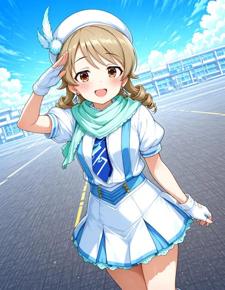 LL_Kotori_Wonderful_Rush_Cos, short sleeves, puffy sleeves, white shirt, skirt, green scarf, feathers, feather hair ornament one side, white gloves, fingerless gloves, white beret, green bow, blue necktie, jewelry, earrings, boots