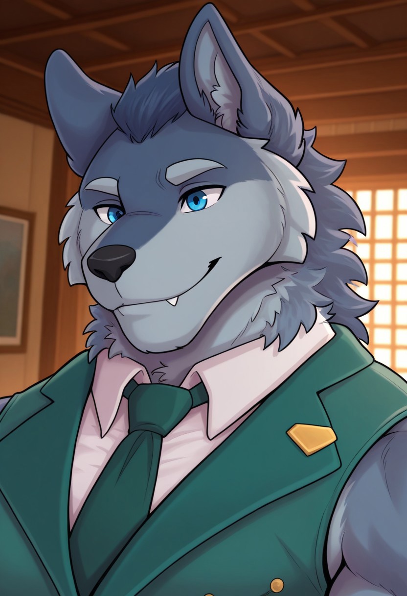 Reinforcement Prompt: "wolf, wolf tail, furry, muscular, manly, mature, large pectorals, chest hair, blue eyes, blue fur"