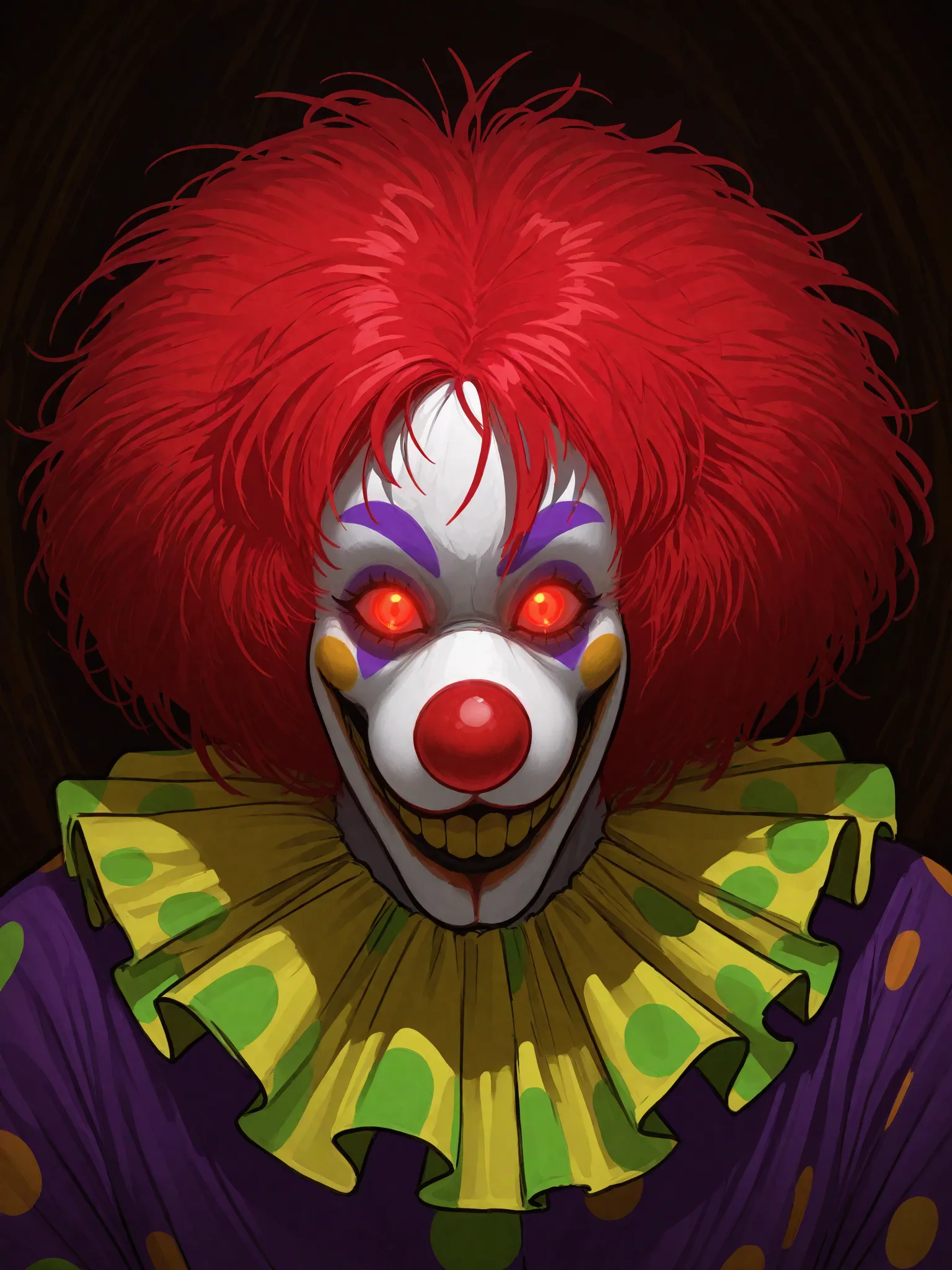 zeebotheclownil, clown, facepaint, male focus, red hair, afro, teeth, horror (theme), 1boy, red nose, evil smile, makeup, glowing eyes, clown shoes,