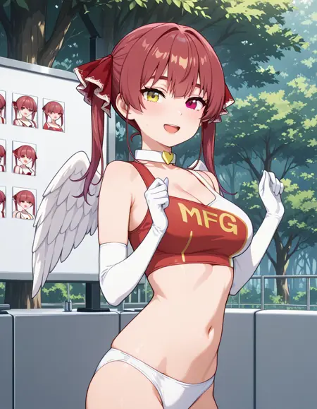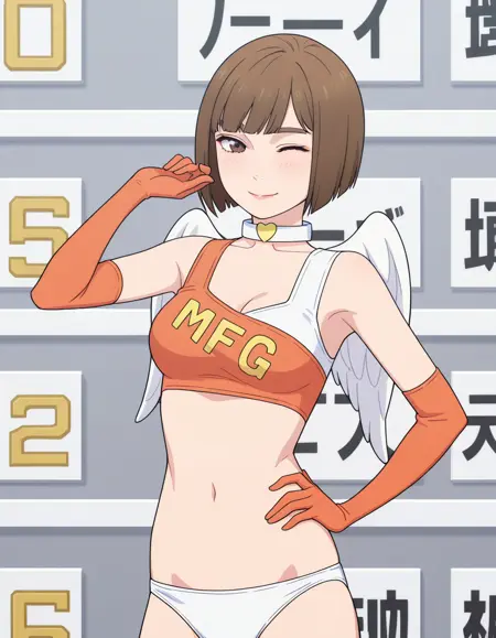 MF Angels: 날개 모양 목걸이, MFG 크롭탑, 흰색 비키니 하의, 팔꿈치 장갑, 부츠,