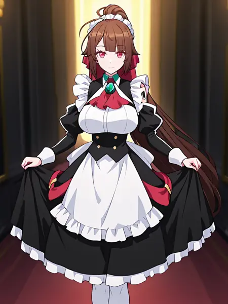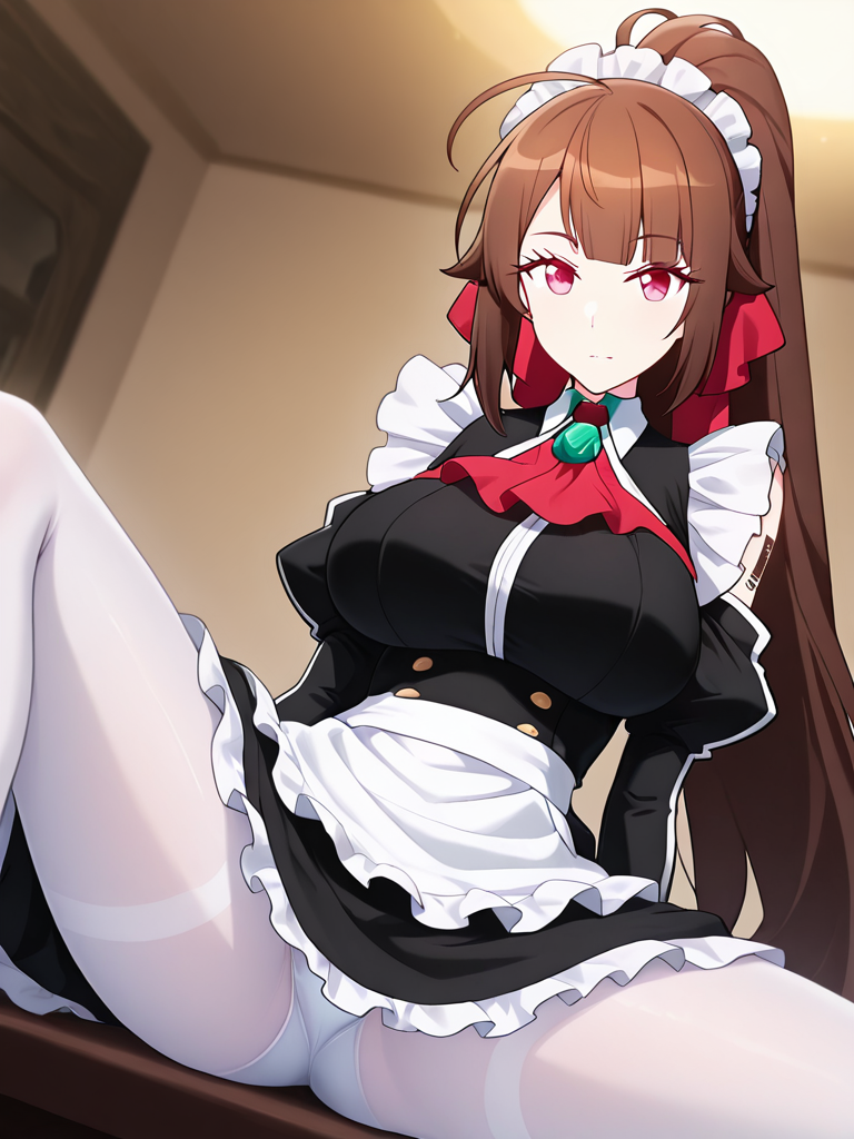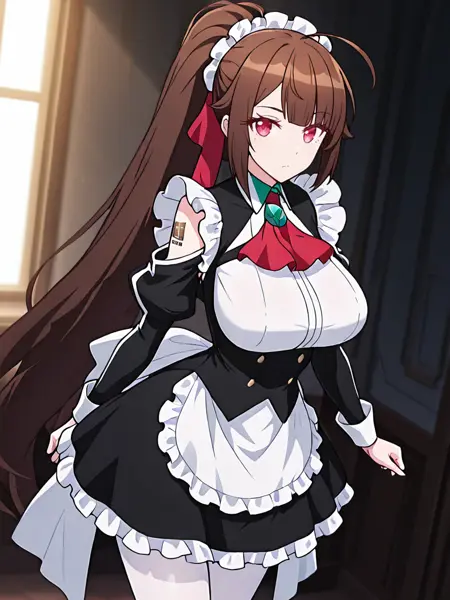 amagidress,enmaided, maid,maid headdress,hair ribbon, frills, black dress, green brooch, red ascot,tattoo, shoulder tattoo, puffy long sleeves, detached sleeves,large breasts, maid apron,white pantyhose,