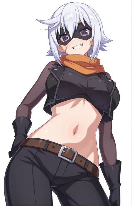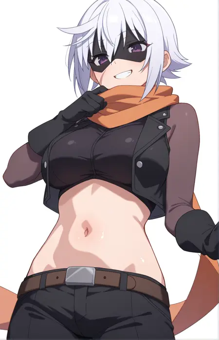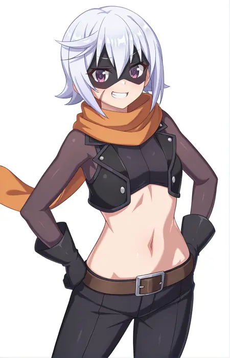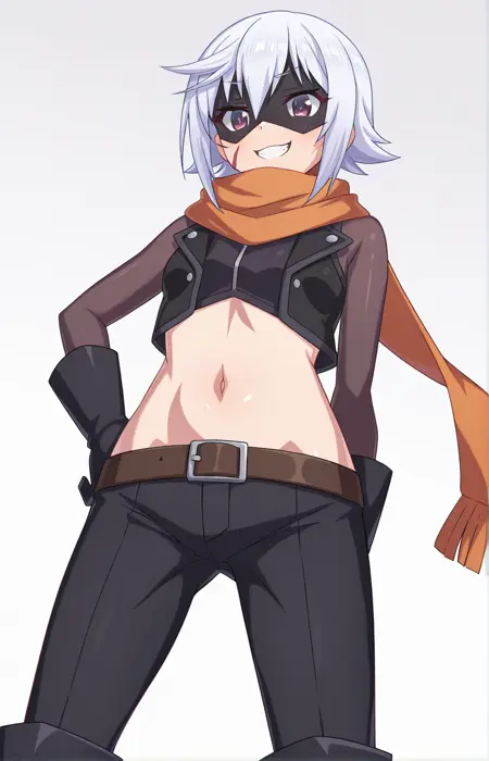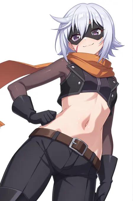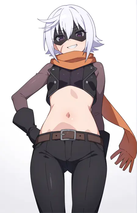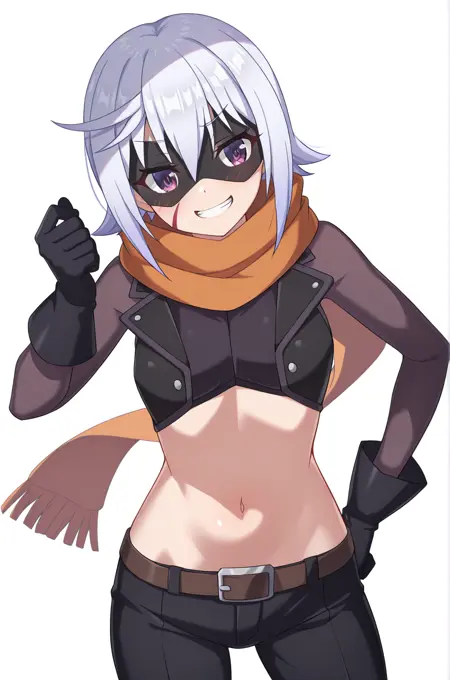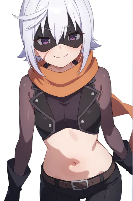 ThiefChris-Liver020,1girl, solo, short hair, purple eyes, bangs, white hair, scar on face, scar on cheek, hair between eyes, black gloves, long sleeves, black pants, belt, midriff, navel, crop top, vest, scarf, orange scarf, mask, goggles, cropped jacket, knee boots, black sleeves, black mask, full mask, long gloves, small breasts, thick thighs