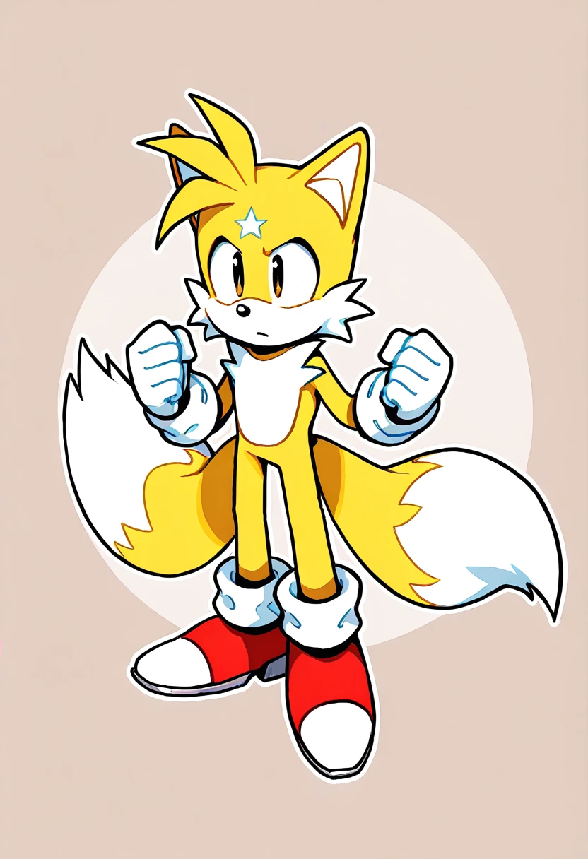 ClassicSuperTails, 1boy, anthropomorphic fox, two tails, golden fur with white muzzle, Two tone fur, large triangular ears, small black nose, three locks of hair on forehead, white gloves, red shoes, sonic the hedgehog,