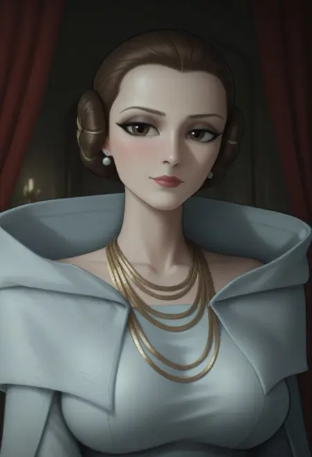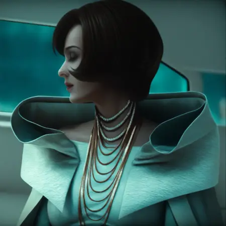structured ivory cape, wide collar, cream textured cape, elegant structured cape, layered gold necklaces, turquoise jewelry, detailed jewelry, short wavy hair, bob haircut, sci-fi nobility outfit, Star Wars senator, elegant woman, detailed clothing.