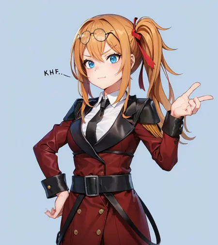 KalinaGK、グリフィン&クリューガー軍服、白いシャツ、ネクタイ、サイドポニーテール、頭にかけたメガネ、オフショルダー、丸メガネ、タイツ