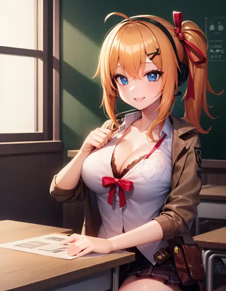 KalinaTactical,棕色背心,裙子,敞开领口,办公室风格,发带,眼镜戴在头上,耳机