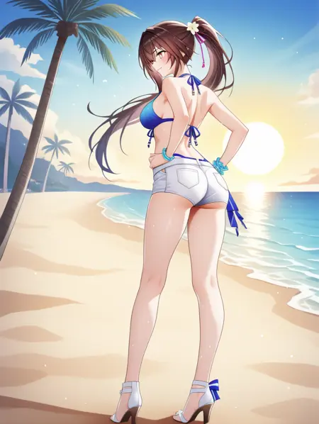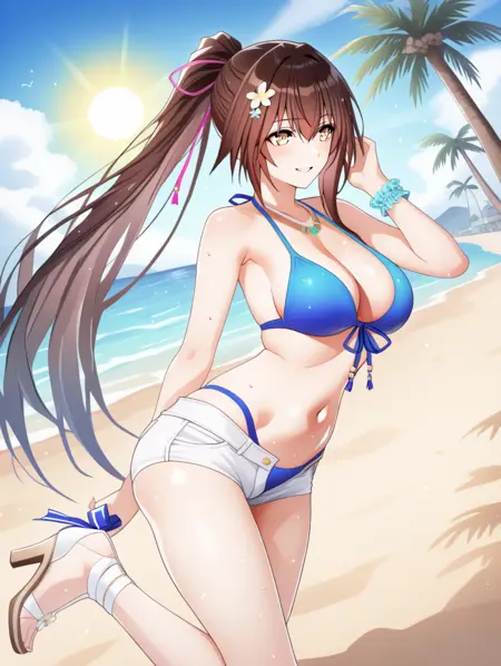 提示词示例:sama,brown hair,ponytail,hair ornament,blue bikini,front-tie bikini top,sush,white short shorts,sandals,high heels,ocean,beach,blue sky,cloud,palm tree,sun,solo,