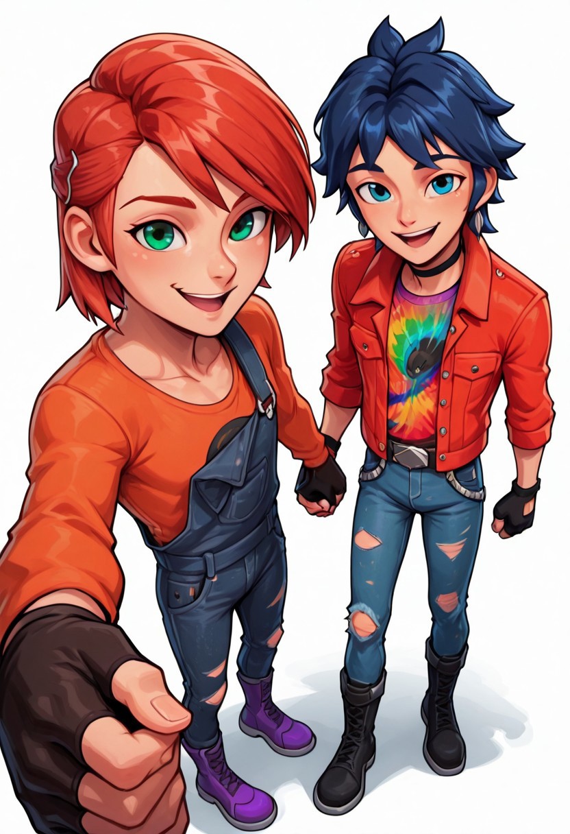 marc, anciel, 短发, 蓝色头发, 绿眼睛, 红色夹克, 开襟衣物, 衬衫, 腰带, 牛仔裤, 牛仔布, 破损衣物, 破损裤子, 破损牛仔裤, 靴子, 黑色鞋履, 裤子, 夹克, 手套, 露指手套, 项圈, 耳环, 饰品,