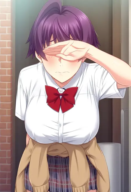 의상: 흰색 칼라 셔츠, 빨간 리본 넥타이, 짧은 소매, 체크 무늬 스커트, 허리 주변의 옷,