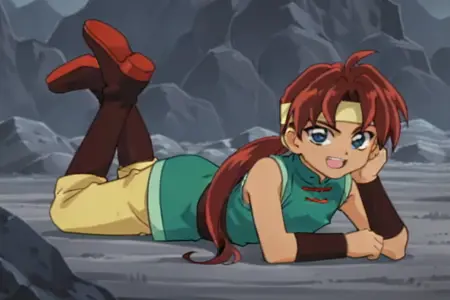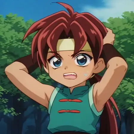 프롬프트: 남성, 붉은 머리카락, 머리 끝을 묶은 팔찌, 긴 머리카락, 머리띠, 파란 눈, 중국 복장, 소매 없음, 팔찌, 노란 바지, 부츠, 야외(숲/푸른 하늘/나무/절벽), 야외(호수/하늘/구름/산), 야외(전장)