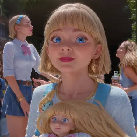 School Uniform 2, Long Sleeves, Serafuku, Light Blue Sailor Collar, Pink Bowtie, Light Blue Pleated Skirt, White Thighhighs, Brown Loafers, School Bag, Holding Cellphone, Pink Cellphone, Diamond Hoop Earrings, Diamond Necklace, Diamond Bracelets