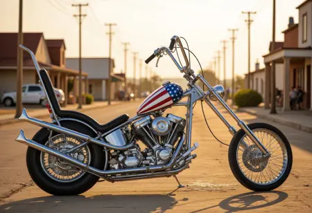 The Easy Rider Cpt America LoRA is tuned to generate detailed, high-fidelity renderings of a custom American chopper motorcycle defined by its patriotic theme and vintage chopper silhouette. It emphasizes a stretched frame, American flag gas tank, black leather seat, and polished chrome components throughout. The model consistently maintains clarity in texture, with reflective metalwork, spoked wheels, and retro-styled handlebars prominently featured.