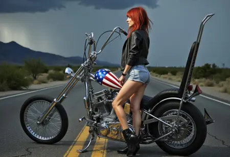 Easy Rider Cpt America LoRA는 애국적 테마와 빈티지 체퍼 실루엣으로 정의된 맞춤형 미국 체퍼 오토바이의 세부적이고 고해상도 렌더링을 생성하도록 튜닝되었습니다. 이 모델은 연장된 프레임, 미국 국기 도안의 연료 탱크, 검정 가죽 시트, 전반적인 폴리싱된 크롬 부품을 강조합니다. 모델은 반사되는 금속 표면, 스포크 휠, 레트로 스타일의 핸들바를 명확하게 표현하며 텍스처의 일관된 선명도를 유지합니다.
