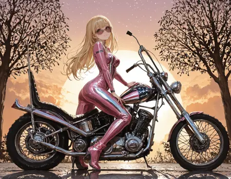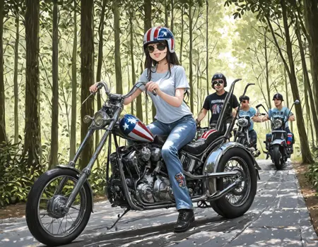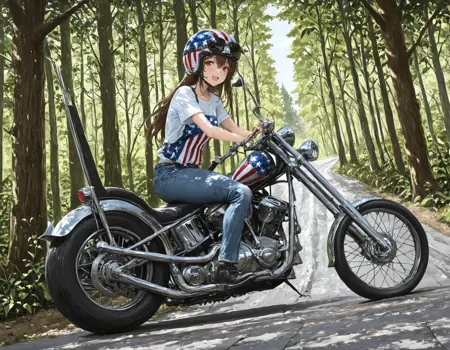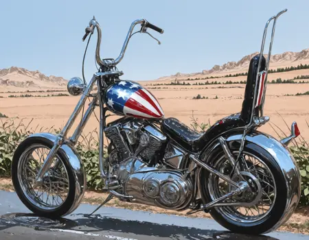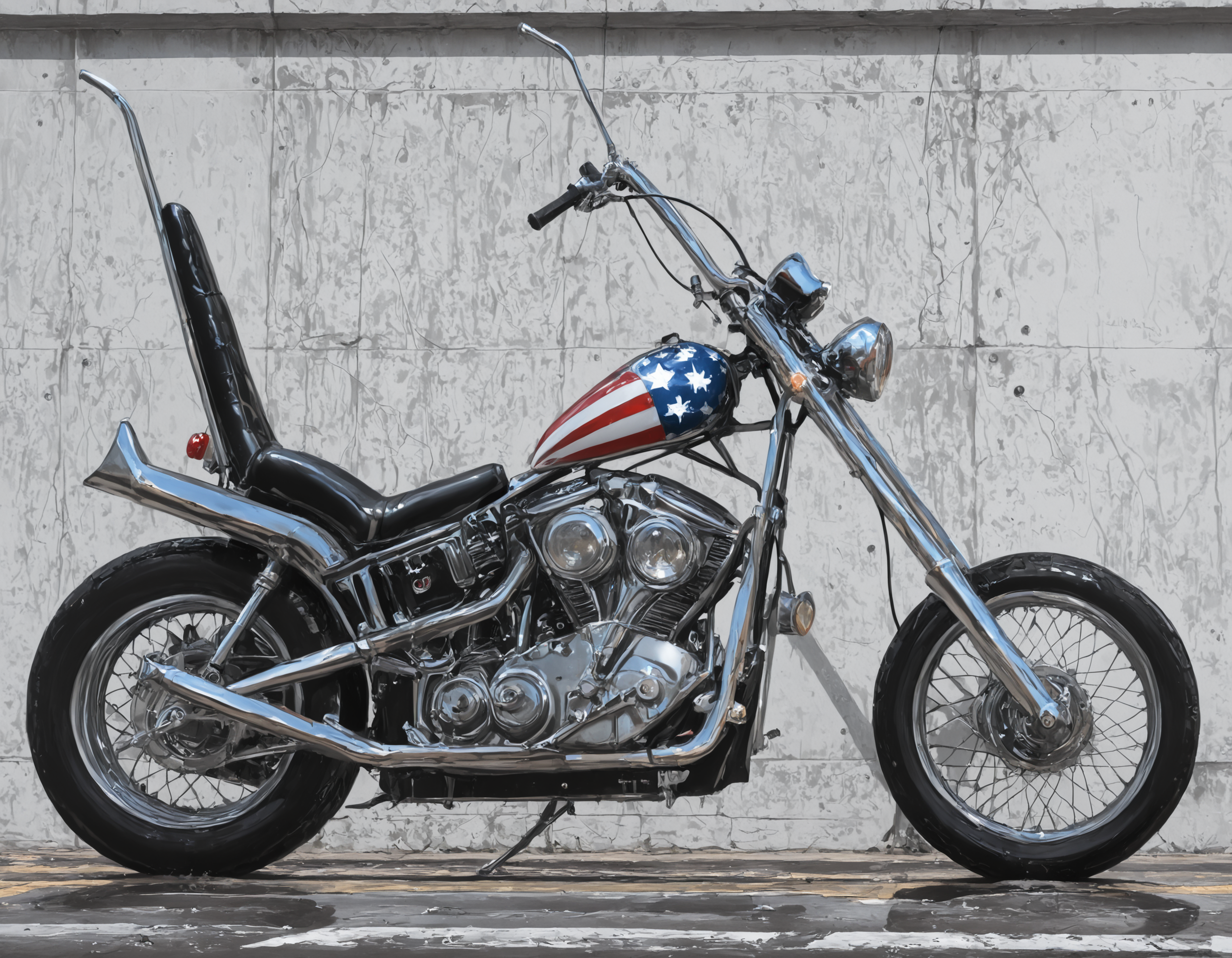 The Easy Rider Cpt America LoRA is tuned to generate detailed, high-fidelity renderings of a custom American chopper motorcycle defined by its patriotic theme and vintage chopper silhouette. It emphasizes a stretched frame, American flag gas tank, black leather seat, and polished chrome components throughout. The model consistently maintains clarity in texture, with reflective metalwork, spoked wheels, and retro-styled handlebars prominently featured.