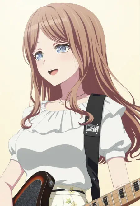 <lora:Nagasaki SoyoV1-Nuclear1811-IL:1>,Nagasaki Soyo,blue eyes,brown hair,long hair,bangs,parted bangs,ch6,ch6 jewelry,ch6 necklace,ch6 collarbone,ch6 shirt,ch6 white shirt,ch6 short sleeves,ch6 puffy sleeves,ch6 puffy short sleeves,ch6 skirt,ch6 long skirt,ch6 floral print,ch6 floral print skirt,ch6 socks,ch6 white socks,ch6 shoes,ch6 yellow footwear,ch6 high heels,
