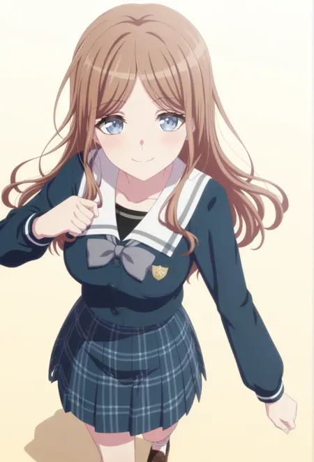 <lora:Nagasaki SoyoV1-Nuclear1811-IL>,Nagasaki Soyo,blue eyes,brown hair,long hair,bangs,parted bangs,ch3,ch3 school uniform,ch3 serafuku,ch3 collarbone,ch3 sailor collar,ch3 white sailor collar,ch3 bow,ch3 grey bow,ch3 bowtie,ch3 school badge,ch3 breast pocket,ch3 shirt,ch3 blue shirt,ch3 long sleeves,ch3 buttons,ch3 skirt,ch3 blue skirt,ch3 pleated skirt,ch3 plaid,ch3 plaid skirt,ch3 socks,ch3 white socks,ch3 bobby socks,ch3 shoes,ch3 brown footwear,ch3 loafers,