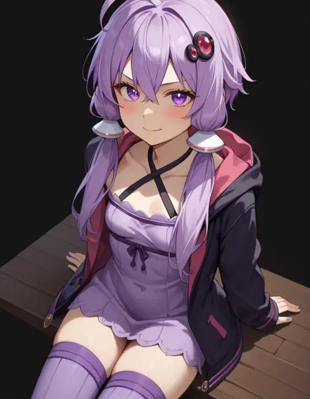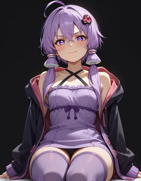 YukariBren, 1girl, 紫色の髪, ゆうかりゆうき, 長い前髪と短い髪、サイドロックス、紫の目、ほほ赤らみ、あほげ、鎖骨、額に髪がかかる、小さな胸、髪のチューブ、細身、背が高い、