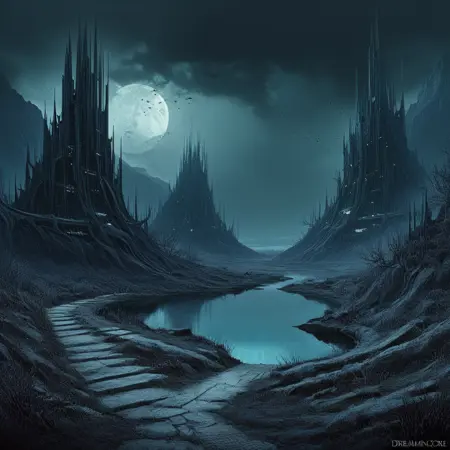 드림코어 미학과 현대적인 다크 판타지가 초현실적으로 융합된 스타일.
