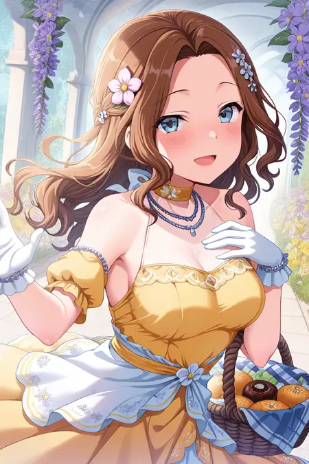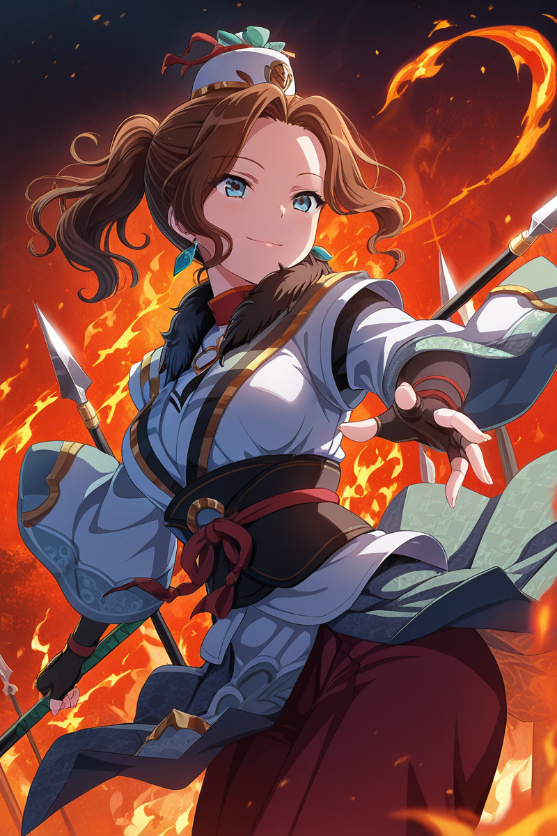 hisame, 1girl, skirt, brown hair, blue skirt, solo, blue eyes, gloves, fingerless gloves, looking at viewer, grey gloves, smile, white gloves, shirt, white shirt, frills, pleated skirt, jacket, closed mouth, shoulder armor, belt, standing, stage outfit