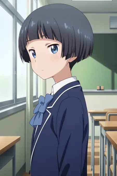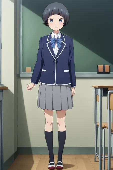 honda sayaka, short hair, black hair, blunt ends, arched bangs, long sleeves, blue jacket, white shirt, collared shirt, blue bowtie, grey skirt, pleated skirt, black socks, kneehighs, uwabaki