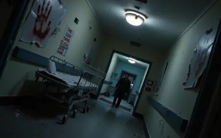 “dutch angle tilt, close-up of a man in shock under flickering neon light”
