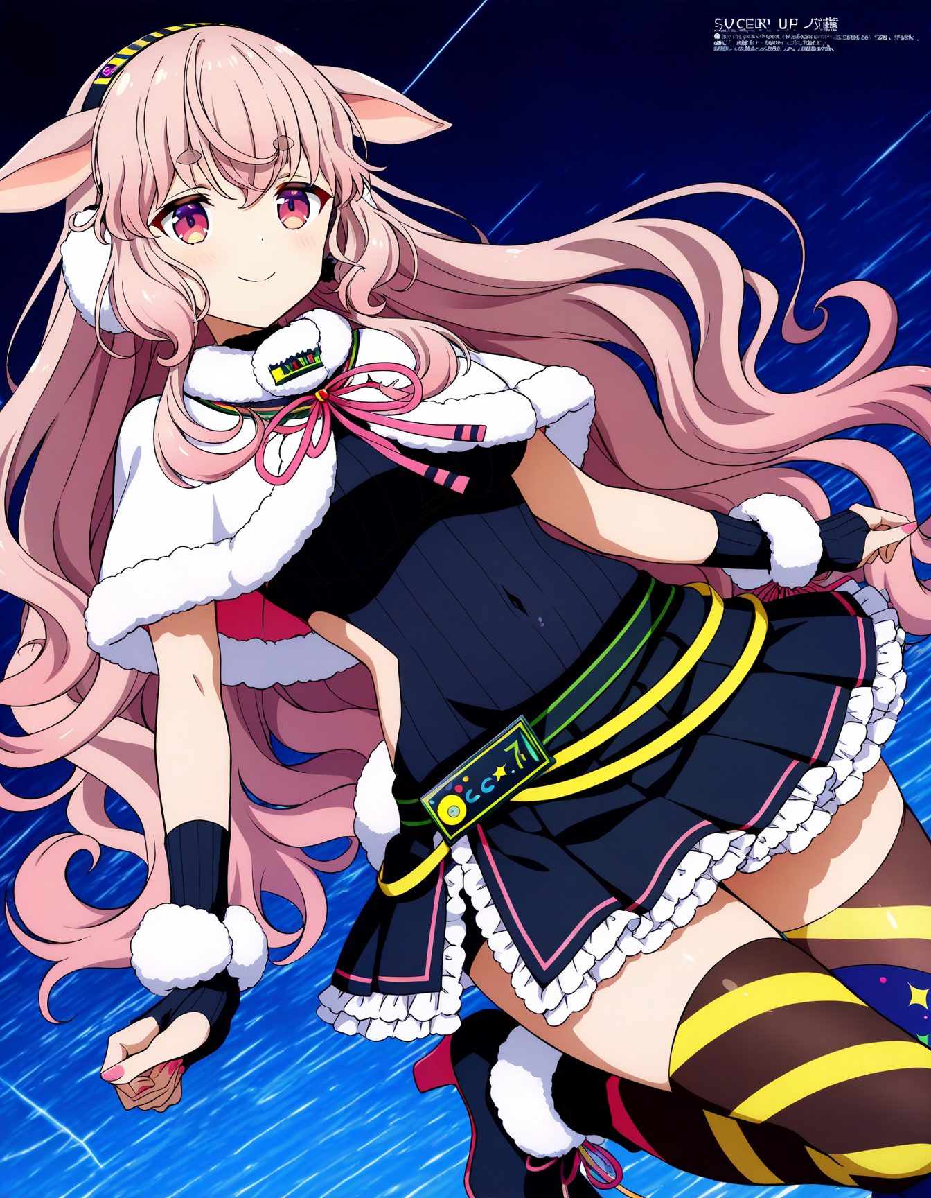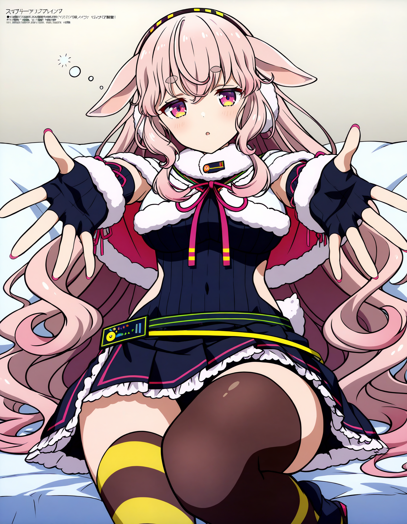| トレーニングワード | <lora:Mokota_mememe:1>,Mokota_mememe, long hair, virtual youtuber,red eyes, sheep ears, animal ears, pink hair, multicolored hair, tail, hairband, pink eyes, rabbit ears, bangs, hair between eyes, thick eyebrows, pink nails, very long hair, nail polish,earmuffs, headphones,コピーしました! gloves, thighhighs, fingerless gloves, skirt, asymmetrical legwear, mismatched legwear, black gloves, fur trim, boots, black skirt, ribbon, black footwear, dress, high heels, capelet, covered navel, sheep girl, frilled skirt, pleated skirt, pink ribbon, frills コピーしました! |