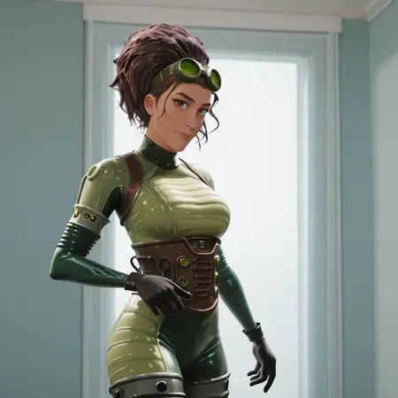 带服装的触发词:oliviaock, 1girl, 头戴护目镜, 深色皮肤女性, 深色皮肤, 棕发, 黑色手套, 连体衣, 中等胸部, 耳后头发, 棕色眼睛, 西部镜头