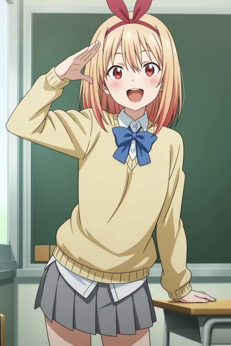 ayase kaori, medium hair, blonde hair, red hairband, bow hairband, wispy bangs, red eyes, long sleeves, yellow sweater, white shirt, collared shirt, blue bowtie, untucked shirt, grey skirt, pleated skirt, black socks, kneehighs, uwabaki